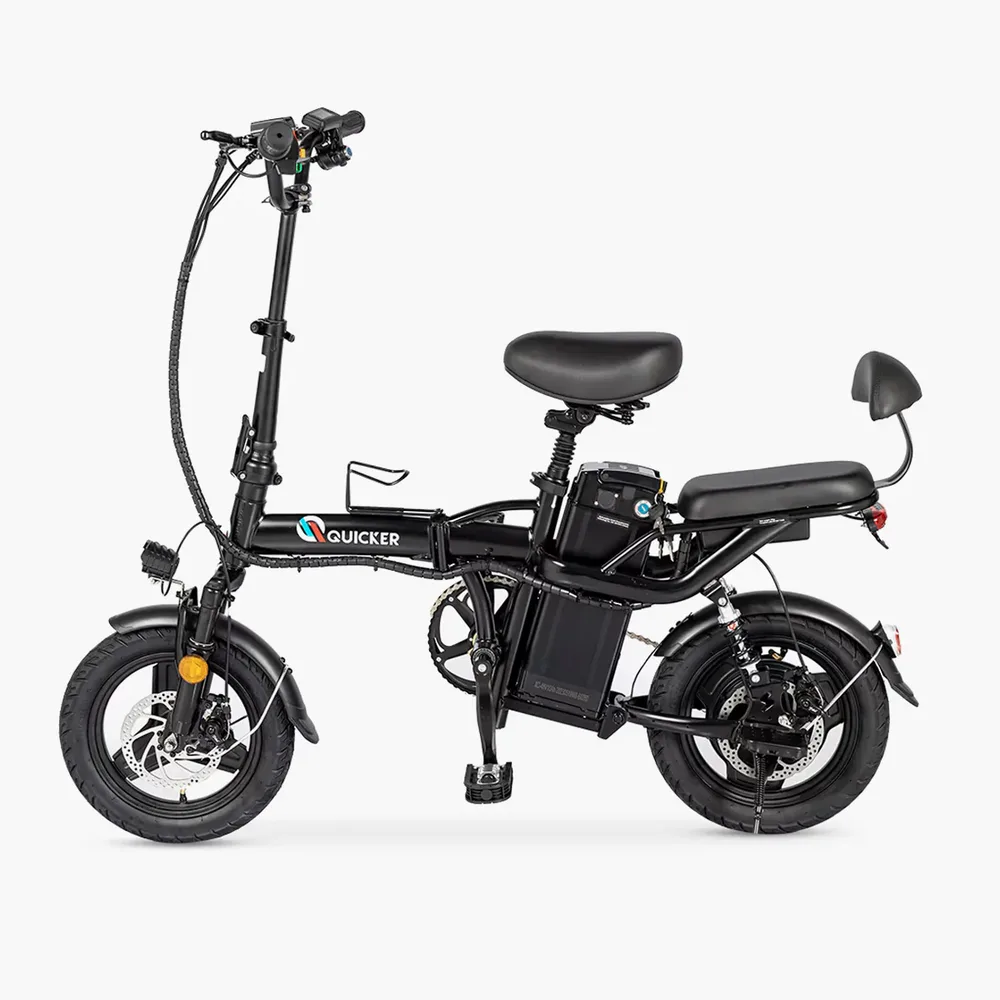 אופני Quicker Mini אופניים חשמליים מתקפלים מצוידים בבולמי זעזועים קדמיים ואחוריים. אופניים חשמליים אלה מגיעים מצוידים במגוון תכונות שימושיות, כולל כיסא הרכבה, מעמד נייד מובנה, רגלייות למושב האחורי, מעמד לבקבוק שתייה, צפצפה איתותים ושיכוך בכיסא. דגם שמתאים לעלות איתו לתחבורה ציבורית ולרכבת.