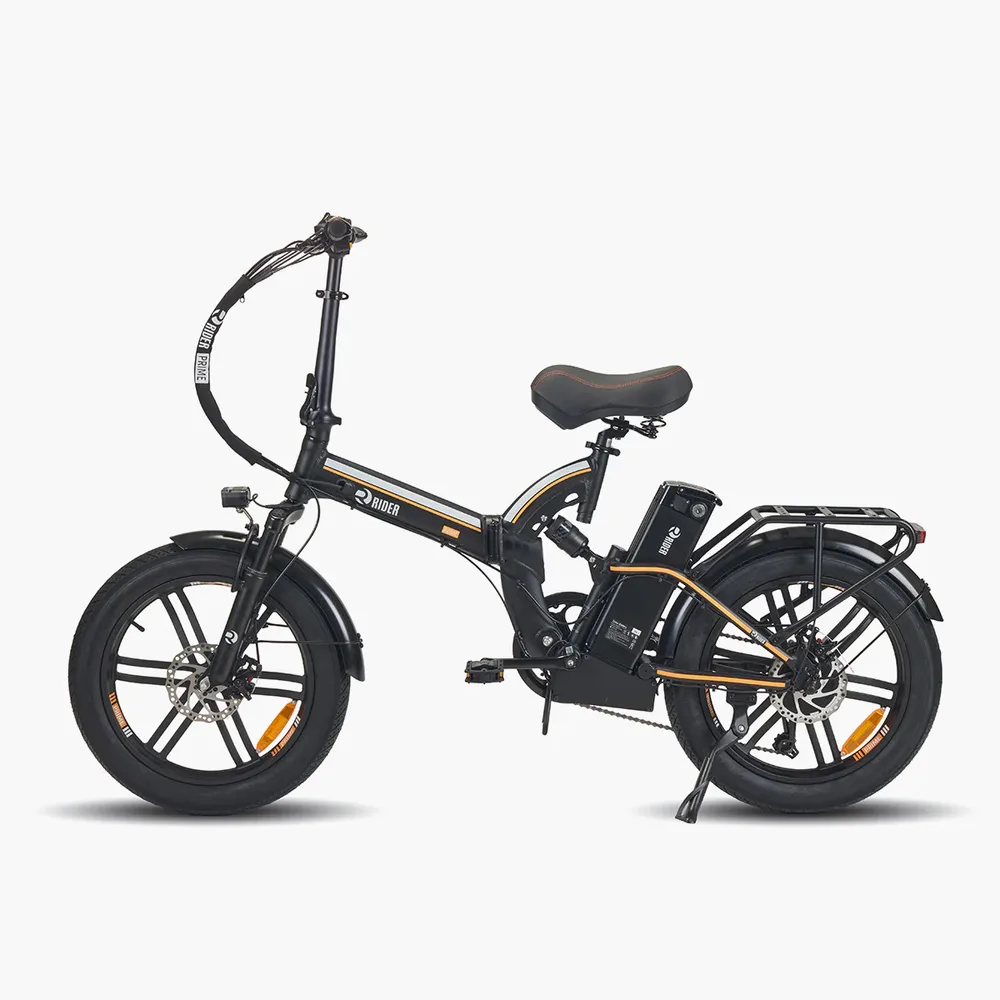 Rider Prime אופניים חשמליים בעלי שלדת אלומיניום עם סוללה נשלפת של 48V/13AH המספקת טווח נסיעה של עד 40 ק"מ. האופניים בעלי ברקסים מכניים דיסק- קידמי ואחורי. מערכת שיכוך מלאה (בולמי זעזועים קידמי ואחורי). צמיגים בגודל 20/3 אינץ' המספקים יציבות מקסימלית. האופניים מאובזרים בכיסא "ספה" נוח, סבל אחורי גדול המאפשר התקנה של כיסא אחורי לילדים, צג לד צבעוני, פנס וצופר